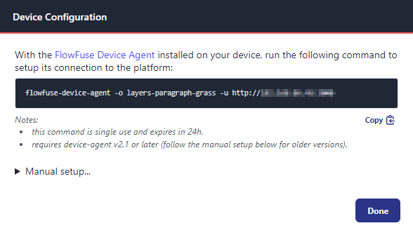 Now, when you create a device on the platform, you will be offered a simple "Setup command". Run this command in a terminal and the let the Device Agent do all the hard work for you.